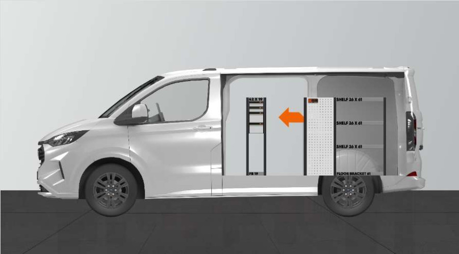 Har du behov av att maximera din Ford Custom & VW Transporter L1 med en extra inredning? Detta är en inredning som låter dig bibehålla bredden i bilen då inredningen är 260mm djup. Serviceinredningen har 4 lådor på kullagerskenor i varierande storlekar för att skapa olika förvaringsmöjligheter. Dessa går att komplettera med insatskit eller lådinsatser för att skapa ordning och reda bland ditt mindre sortiment. Hyllutrymmet bakom lådhurtsen kompletteras ofta med modulbackar. Fördelad lastvikt i lådorna på kullagerskenor är 35kg/st. Lådornas innermått är (mm) B-163, D-387, H-60 och H-130.