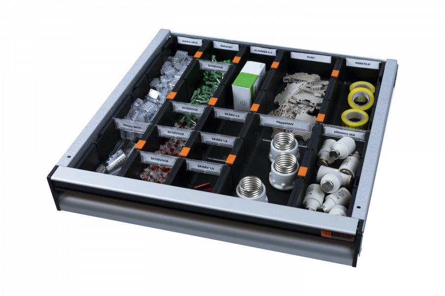 varje insatslåda och avdelare har ett etikettfack för att skapa de bästa förutsättningarna för ordning och reda i din transportbil.