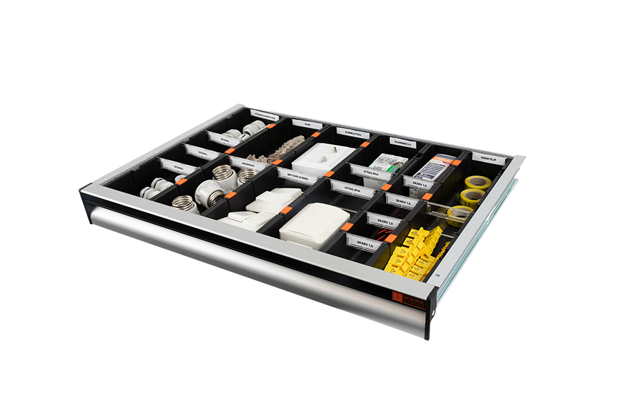 varje insatslåda och avdelare har ett etikettfack för att skapa de bästa förutsättningarna för ordning och reda i din transportbil.