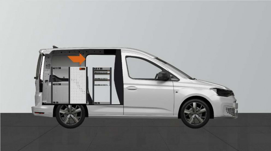 Bilinredning med smidig åtkomst till kullagrade lådor vid sidodörren till VW Caddy Cargo & Ford Connect L1.