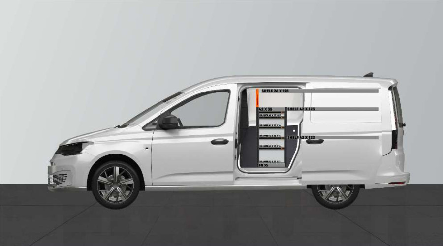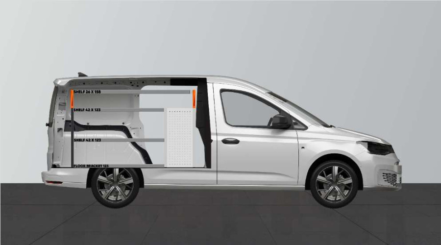 Med denna bilinredning får du mycket förvaring i både hyllor och lådor passande VW Caddy Cargo & Ford Connect L2.