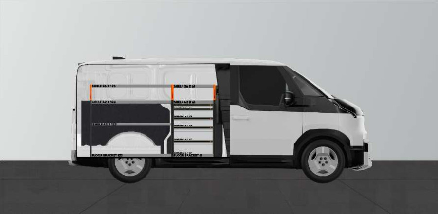 Med denna bilinredning får du mycket förvaring i både hyllor och lådor passande KIA PV5 L2H1.