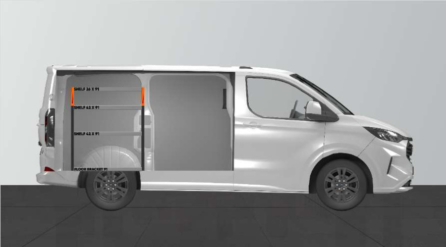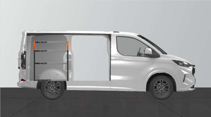 En kortare bilinredning till din Ford Custom & VW Transporter L1 som ger bra förvaringsalternativ för såväl verktygsväskor och maskiner som det mindre sortimentet. Inredningens hyllor med ett djup på 420mm gör att de flesta av marknadens verktygsväskor passar perfekt. Den översta hyllan på 262,5mm kompletteras ofta med våra modulbackar för att ge det mindre sortimentet var sin plats. Inredningen passar till bilar både med och utan sidodörrar. Glöm inte bort att utnyttja verktygstavlan på gaveln.