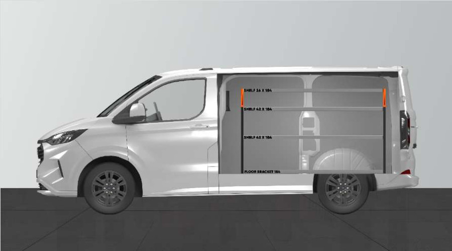 En bilinredning till din Ford Custom & VW Transporter L1 som ger bra förvaringsalternativ för såväl verktygsväskor och maskiner som det mindre sortimentet. Inredningens hyllor med ett djup på 420mm gör att de flesta av marknadens verktygsväskor passar perfekt. Den översta hyllan på 262,5mm kompletteras ofta med våra modulbackar för att ge det mindre sortimentet var sin plats. Glöm inte bort att utnyttja verktygstavlan på gaveln.