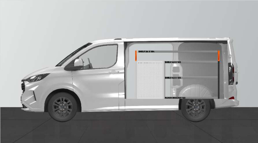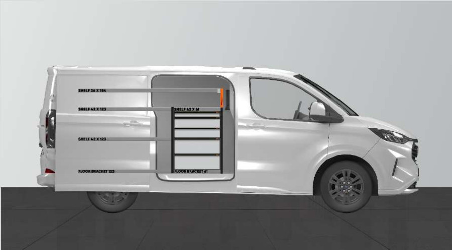 Med denna bilinredning får du mycket förvaring i både hyllor och lådor passande Ford Custom & VW Transporter l1.
