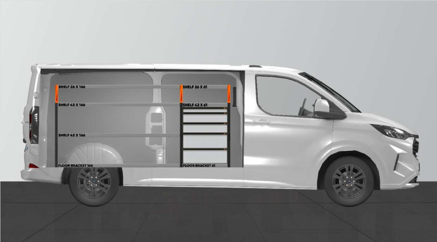 Detta är ett av de mest populära systemen till Ford Custom & VW Transporter L2. Inredningen ger bra förvaringsmöjligheter för såväl verktygsväskor och maskiner som det mindre sortimentet. Du får en lådhurts med 5 st lådor i varierande storlekar för att ge var sak sin plats. Lådorna på kullagerskenor kompletteras ofta med våra nya lådinsatser och avdelare för att skapa bästa struktur. Att komplettera gaveln med vår smartbox är också ett populärt alternativ för att maximera förvaringsutrymmet.