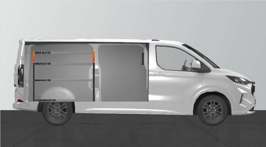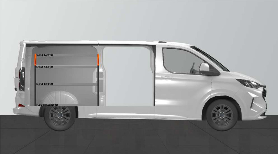En kortare bilinredning till din Ford Custom & VW Transporter L2 som ger bra förvaringsalternativ för såväl verktygsväskor och maskiner som det mindre sortimentet. Inredningens hyllor med ett djup på 420mm gör att de flesta av marknadens verktygsväskor passar perfekt. Den översta hyllan på 262,5mm kompletteras ofta med våra modulbackar för att ge det mindre sortimentet var sin plats. Inredningen passar till bilar både med och utan sidodörrar. Glöm inte bort att utnyttja verktygstavlan på gaveln.
