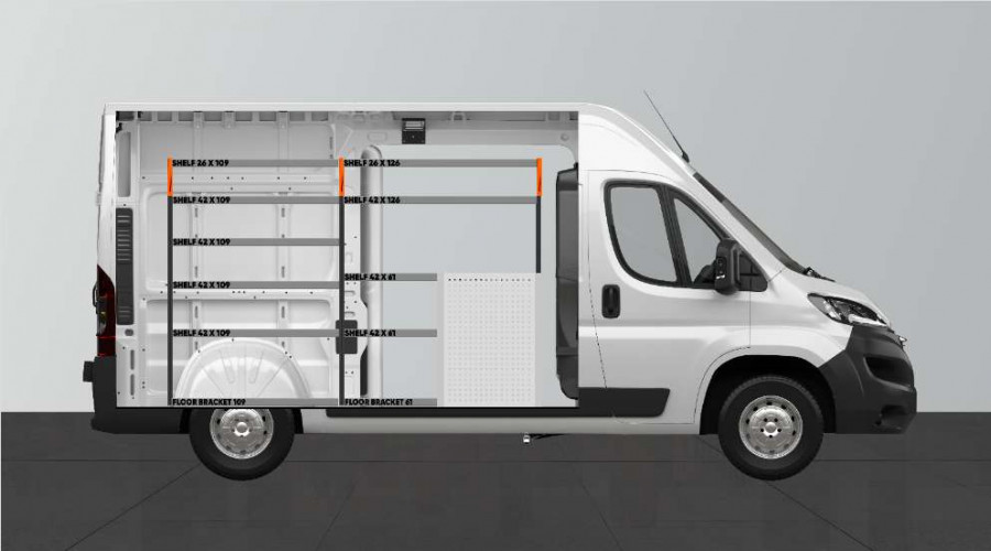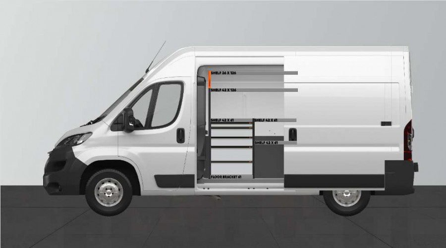 Med denna bilinredning får du mycket förvaring i både hyllor och lådor passande Proace Max, Boxer, Ducato, Jumper & Movano L2.