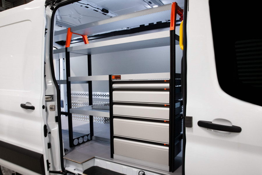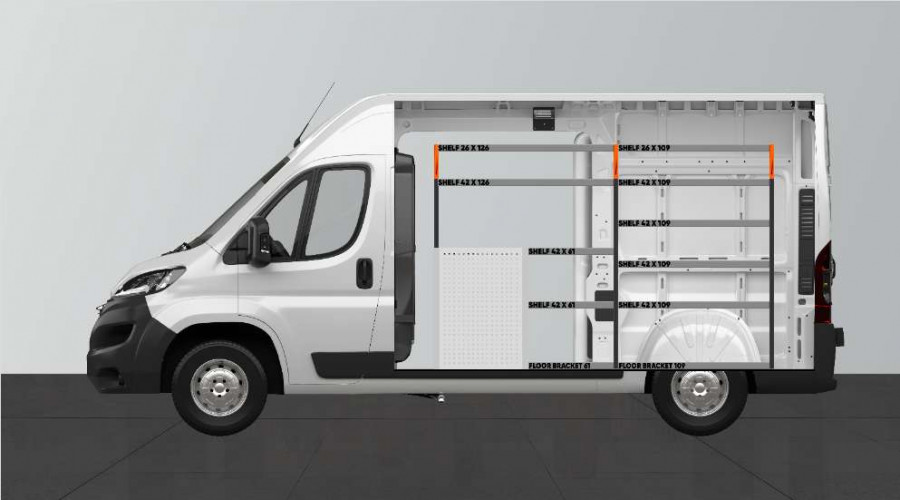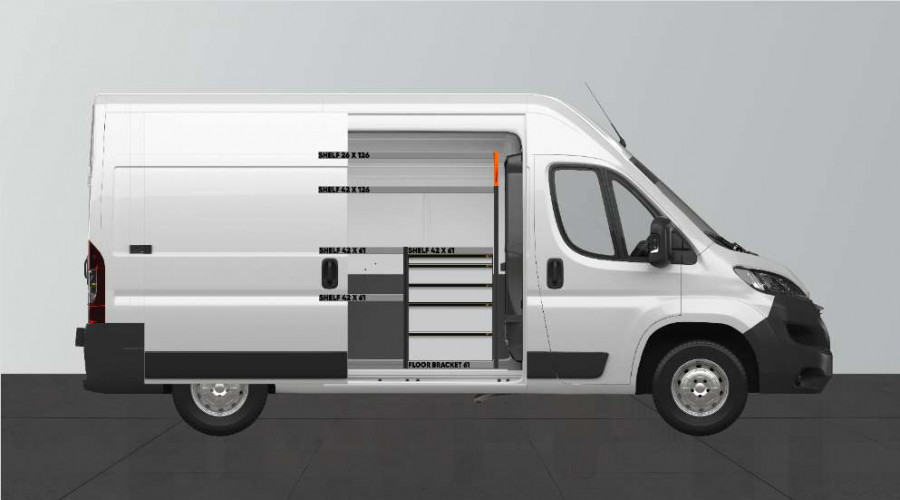 Detta är ett av de mest populära systemen till Proace Max, Peugeot Boxer, Fiat Ducato, Citroen Jumper 2010- & Opel Movano 2021- L2 med sidodörr på inredningens sida. Inredningen ger bra förvaringsmöjligheter för såväl verktygsväskor och maskiner som det mindre sortimentet. Du får en lådhurts med 5st lådor i varierande storlekar för att ge var sak sin plats. Bakom lådorna är en verktygstavla placerad för extra hängmöjligheter i bilen. Lådorna på kullagerskenor kompletteras ofta med våra nya lådinsatser och avdelare för att skapa bästa struktur. Att komplettera gaveln med vår smartbox är också ett populärt alternativ för att maximera förvaringsutrymmet.