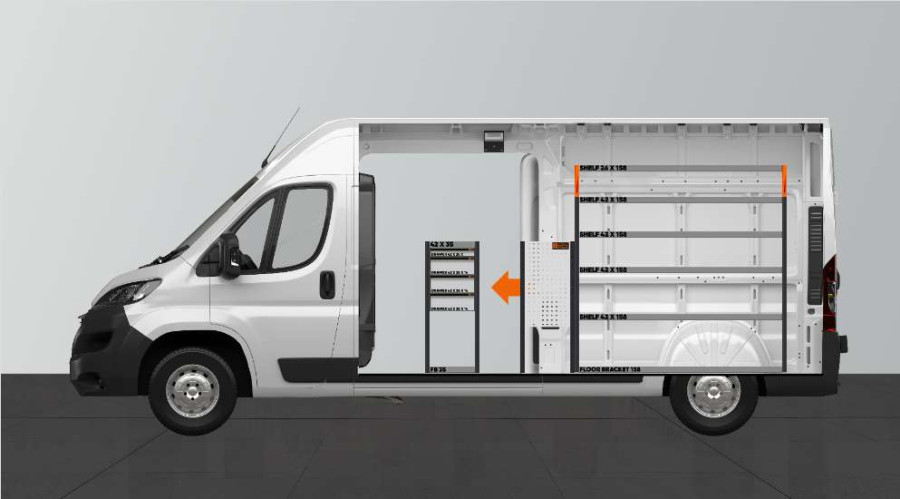 Detta är den inredning som är mest populär att komplettera sin högersida med till Proace Max, Peugeot Boxer, Fiat Ducato och Citroen Jumper L3H2. Inredningen ger varierade förvaringsmöjligheter. För det första ger lådorna på kullagerskenorna smidig åtkomst vid sidodörren. Lådorna dras ut i färdriktningen och ger bra överblick. Dessa går att komplettera med lådavdelare för att bäst skapa ordning och reda för ditt mindre sortiment. För det andra ger våra djupa hyllor bra förvaringsmöjligheter för såväl verktygsväskor som mindre maskiner. Fördelad lastvikt i lådorna på kullagerskenor är 35kg/st. Lådornas innermått är (mm) B-308, D-387, H-60 och H-130.