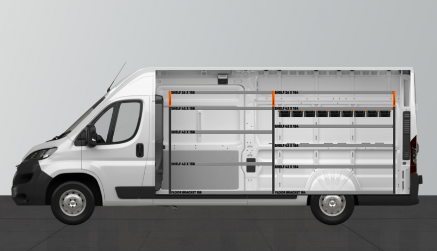 En bilinredning för dig som redan från början bestämt dig för att skapa bäst ordning och reda i din Proace Max, Peugeot Boxer, Fiat Ducato och Citroen Jumper L4H2. I denna inredning ingår 8 st av våra nya, smarta modulbackar. Du kan smidigt dra ut dessa på våra modulbacks-skenor. Dessa är även smidiga att justera och flytta längs med hyllorna. Självklart ges det bra förvaringsmöjligheter även för dina verktygsväskor, maskiner och material då de djupa hyllorna är 420mm.