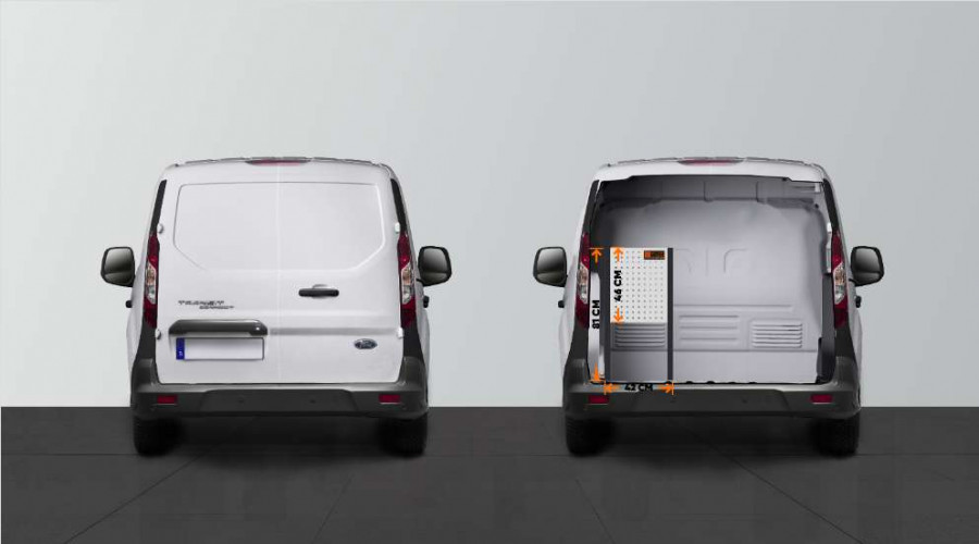 Bilinredning med smidig åtkomst till kullagrade lådor vid sidodörren till Ford Connect L1.