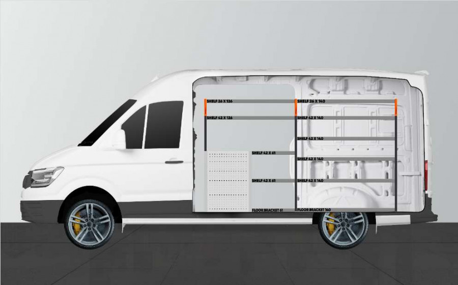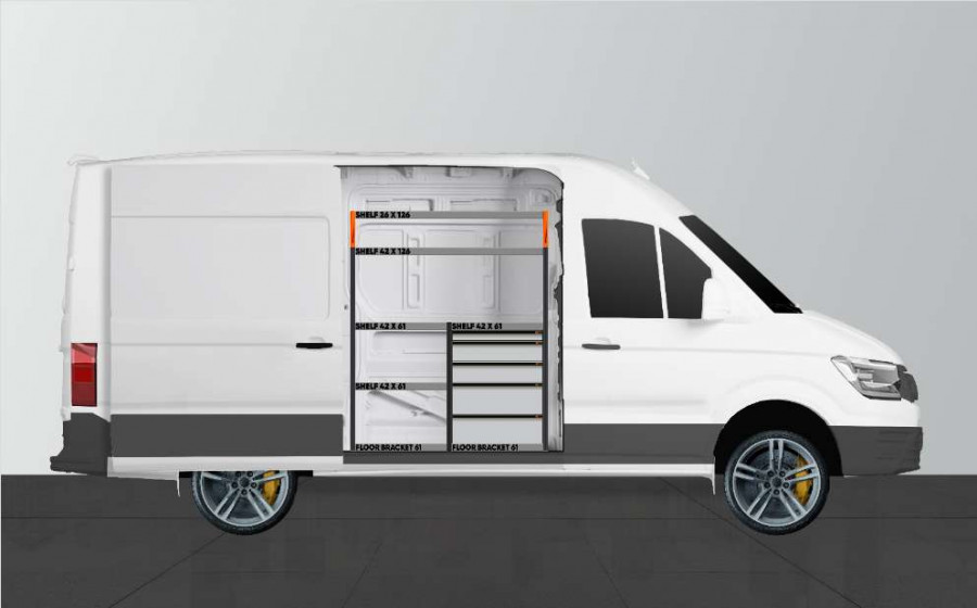 Med denna bilinredning får du mycket förvaring i både hyllor och lådor passande Man TGE & VW Crafter L3.