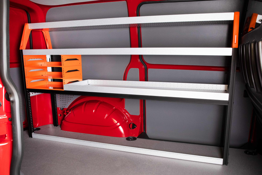En populär inredning för dig som behöver bra förvaringsmöjligheter för såväl ditt mindre sortiment som verktygsväskor och maskiner. Denna serviceinredning innehåller 3st sortimenthållare som är anpassade för marknadens mest populära sortimentlåda, Racco Carrylight. Dessa sortimentlådor kan inredningen kompletteras med om så önskas. Bilinredningen passar perfekt till din Maxus e-Deliver 3 L1.
