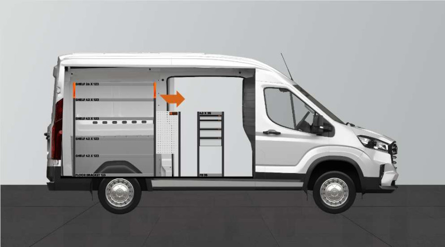 En av de mest populära inredningarna till Maxus e-Deliver 9 L2. Inredningen ger varierande förvaringsmöjligheter då lådorna på kullagerskenorna ger smidig åtkomst via sidodörren samtidigt som lådorna kan dras ut i färdriktningen för att ge en bra överblick. Dessa går att komplettera med lådavdelare för att maximera strukturen bland det mindre sortimentet. Våra djupa hyllor ger även bra förvaringsmöjligheter för såväl verktygsväskor som mindre maskiner. Fördelad lastvikt i lådorna på kullagerskenor är 35kg/st. Lådornas innermått är (mm) B:308, D:387, H:60 och H:130.