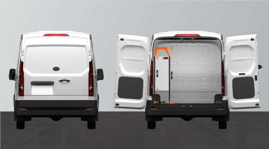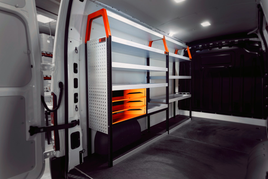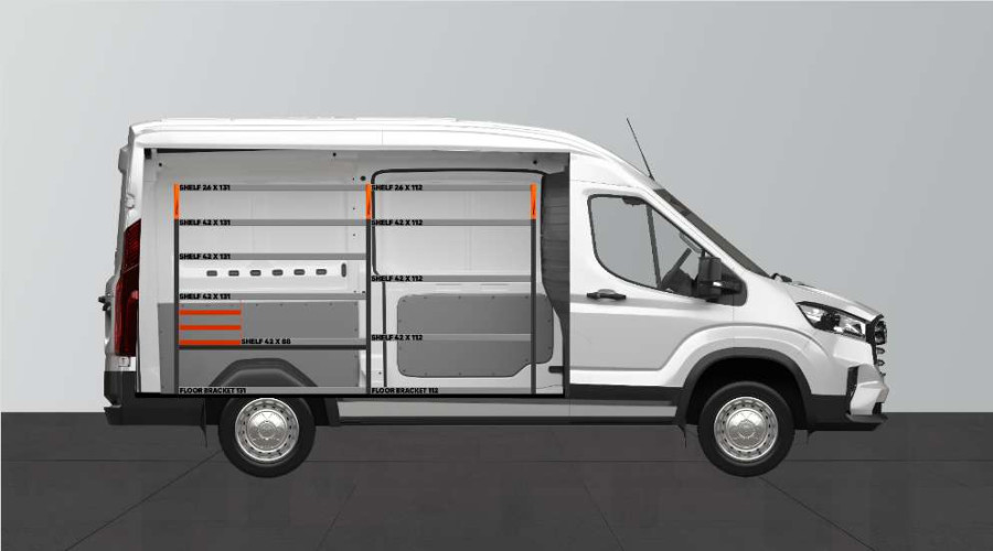 Bedrijfswageninrichting voor wie assortimentstassen in de Maxus e-Deliver 9 L2 gebruikt.