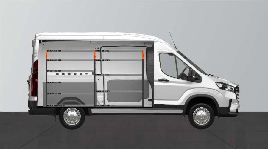 En bilinredning till din Maxus e-Deliver9 L2 som ger bra förvaringsalternativ för såväl verktygsväskor och maskiner som det mindre sortimentet. Inredningens hyllor med ett djup på 420mm gör att de flesta av marknadens verktygsväskor passar perfekt. Den översta hyllan på 262,5mm kompletteras ofta med våra modulbackar för att ge det mindre sortimentet var sin plats. Glöm inte bort att utnyttja verktygstavlan på gaveln.