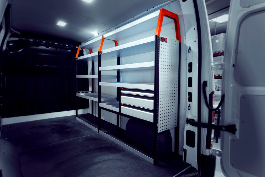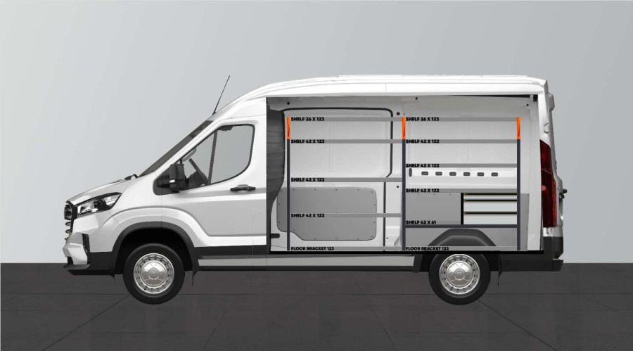 Med en mix av lådor och hyllor är detta en mycket populär bilinredning som passar Maxus e-Deliver 9 L2.
