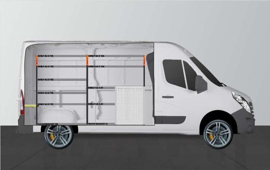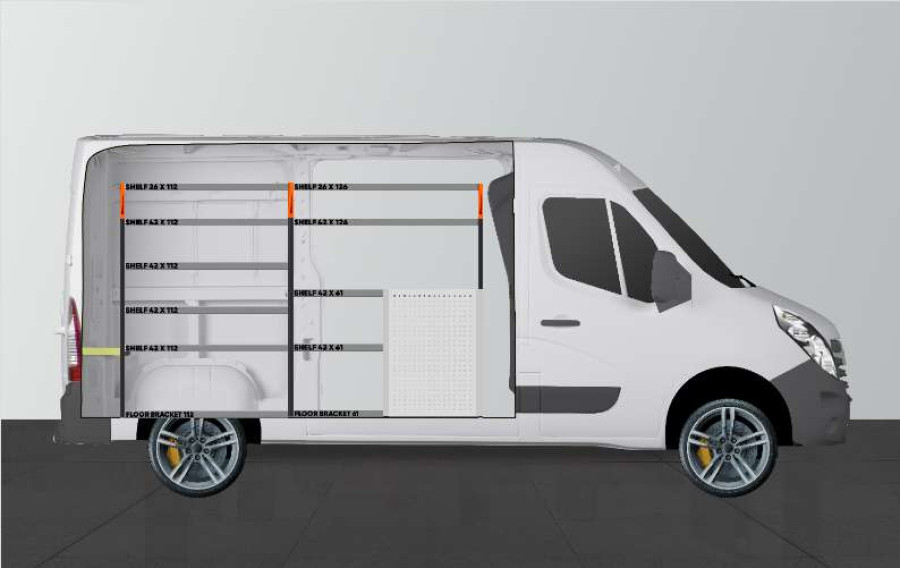 Detta är ett av de mest populära systemen till Opel Movano, Renualt Master & Nissan NV400. Inredningen ger bra förvaringsmöjligheter för såväl verktygsväskor och maskiner som det mindre sortimentet. Du får en lådhurts med 5st lådor i varierande storlekar för att ge var sak sin plats. Lådorna på kullagerskenor kompletteras ofta med våra nya lådinsatser och avdelare för att skapa bästa struktur. Att komplettera gaveln med vår smartbox är också ett populärt alternativ för att maximera förvaringsutrymmet.
