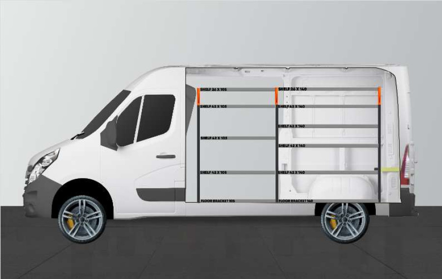 En bilinredning till din Opel Movano, Renault Master och Nissan NV400 som ger bra förvaringsalternativ för såväl verktygsväskor och maskiner som det mindre sortimentet. Inredningens hyllor med ett djup på 420mm gör att de flesta av marknadens verktygsväskor passar perfekt. Den översta hyllan på 262,5mm kompletteras ofta med våra modulbackar för att ge det mindre sortimentet var sin plats. Glöm inte bort att utnyttja verktygstavlan på gaveln.