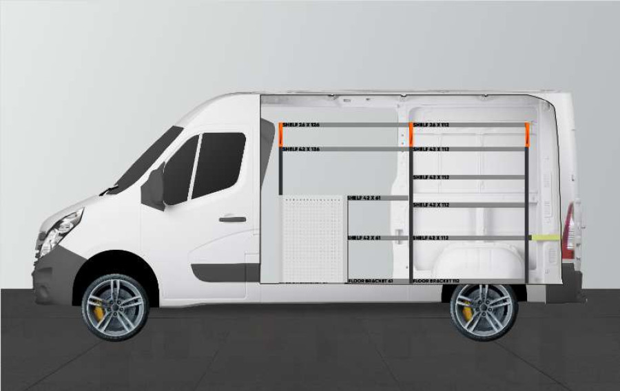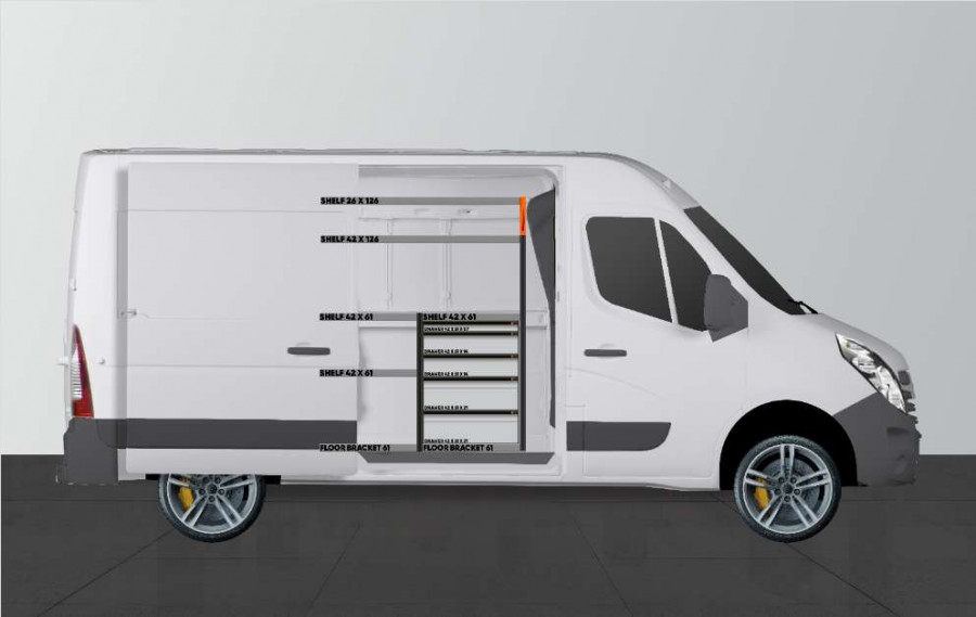 Detta är ett av de mest populära systemen till Opel Movano, Renualt Master & Nissan NV400. Inredningen ger bra förvaringsmöjligheter för såväl verktygsväskor och maskiner som det mindre sortimentet. Du får en lådhurts med 5st lådor i varierande storlekar för att ge var sak sin plats. Lådorna på kullagerskenor kompletteras ofta med våra nya lådinsatser och avdelare för att skapa bästa struktur. Att komplettera gaveln med vår smartbox är också ett populärt alternativ för att maximera förvaringsutrymmet.