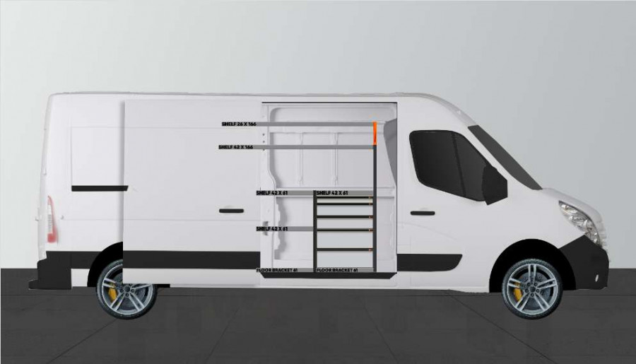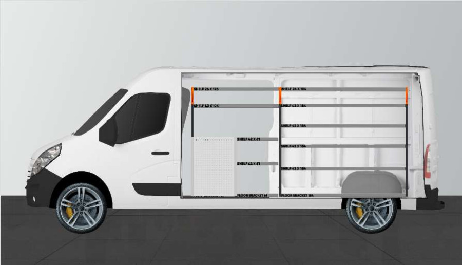 Detta är ett av de mest populära systemen till Opel Movano, Renault Master & Nissan NV400 L3 med sidodörr på inredningens sida. Inredningen ger bra förvaringsmöjligheter för såväl verktygsväskor och maskiner som det mindre sortimentet. Du får en lådhurts med 5st lådor i varierande storlekar för att ge var sak sin plats. Bakom lådorna är en verktygstavla placerad för extra hängmöjligheter i bilen. Lådorna på kullagerskenor kompletteras ofta med våra nya lådinsatser och avdelare för att skapa bästa struktur. Att komplettera gaveln med vår smartbox är också ett populärt alternativ för att maximera förvaringsutrymmet.