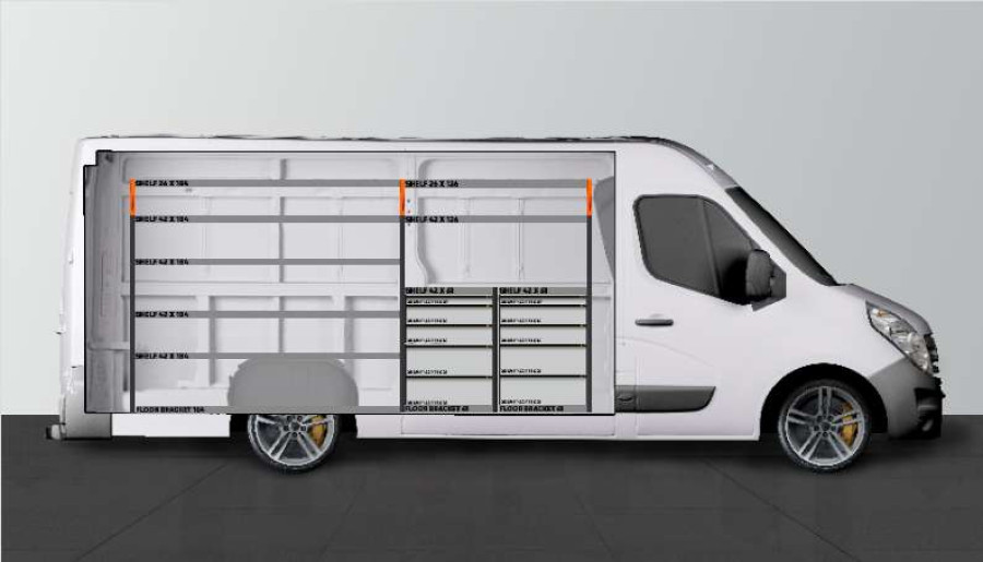 Är du på jakt efter en inredning med mycket lådor? Ställer du dessutom stora krav på inredningen? Då är detta det perfekta alternativet för dig och din Opel Movano, Renault Master & Nissan NV400 L3. Inredningen ger bra förvaringsmöjligheter för såväl verktygsväskor och maskiner som det mindre sortimentet. Totalt ingår 10x lådor på kullagerskenor. Du får också en lådhurts med lådor av varierande storlekar för att ge var sak sin plats. Lådorna på kullagerskenor är populära att komplettera med våra lådinsatser och avdelare för att skapa bästa struktur.