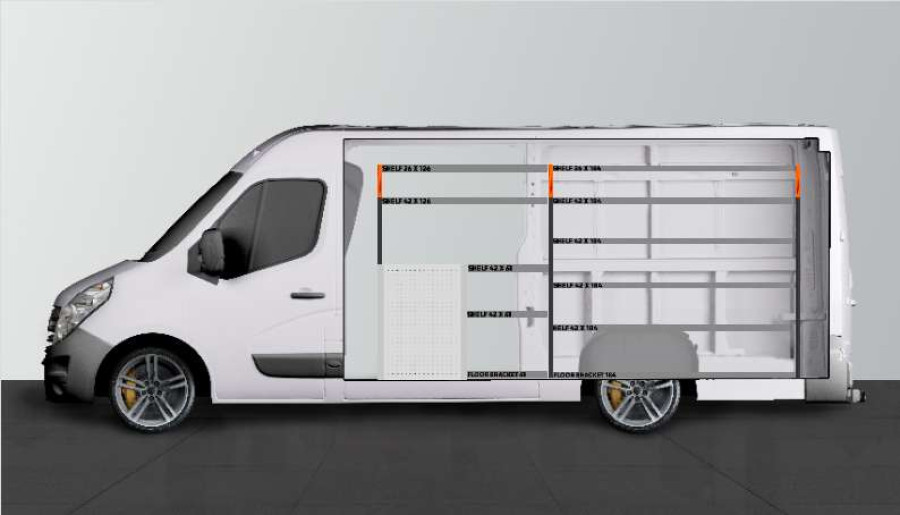 Med denna bilinredning får du mycket förvaring i både hyllor och lådor passande Movano, Master & NV400 L3.