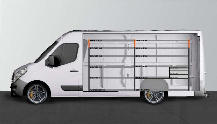 Med en mix av lådor och hyllor är detta en mycket populär bilinredning som passar Movano, Master & NV400 L3.
