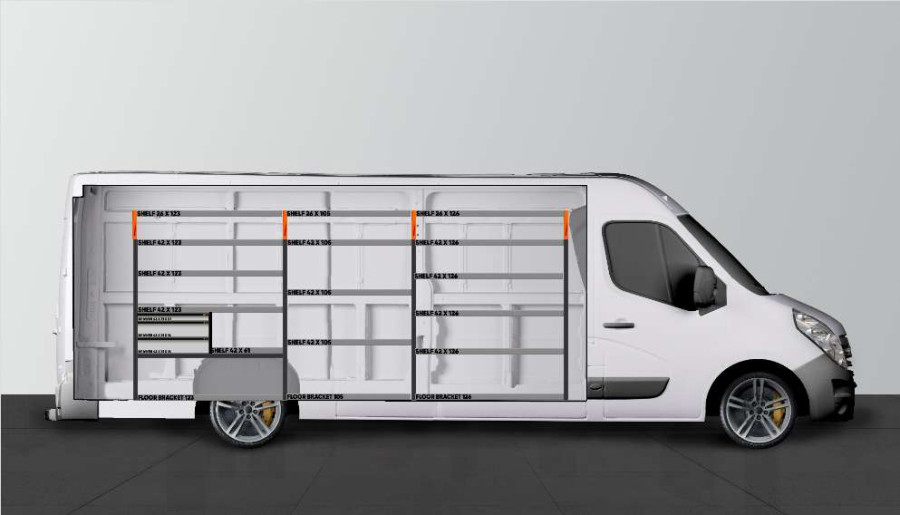 Detta är en av våra mest populära bilinredningar till Movano, Master & NV400 L4H2. Du får bra förvaringsmöjligheter för såväl dina verktygsväskor, maskiner, förbrukningsmaterial och ditt absolut minsta sortiment. Detta till marknadens bästa pris. Lådorna är populära att komplettera med våra nya sortimentlådor. Att komplettera gaveln med våra nya Smartbox brukar också vara ett populärt alternativ för att maximera förvaringsutrymmet. Fördelad lastvikt i lådorna på kullagerskenor är 35kg/st. Lådornas innermått är (mm) B-579, D-387, H-60 samt H-130.