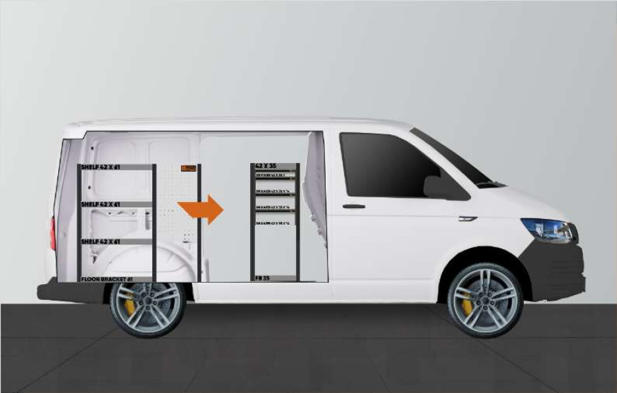 En av de mest populära inredningarna till Volkswagen Transporter L1. Inredningen ger varierande förvaringsmöjligheter då lådorna på kullagerskenorna ger smidig åtkomst via sidodörren samtidigt som lådorna kan dras ut i färdriktningen för att ge en bra överblick. Dessa går att komplettera med lådavdelare för att maximera strukturen bland det mindre sortimentet. Våra djupa hyllor ger även bra förvaringsmöjligheter för såväl verktygsväskor som mindre maskiner. Fördelad lastvikt i lådorna på kullagerskenor är 35kg/st. Lådornas innermått är (mm) B:308, D:387, H:60 och H:130.