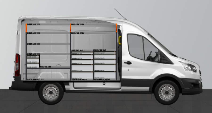 På jakt efter en inredning med mycket lådor? Har du dessutom stora krav? Då är detta alternativet för dig och din Ford Transit L2H2. Totalt får du här 13 st lådor på kullagerskenor. Inredningen ger bra förvaringsmöjligheter för såväl dina verktygsväskor, maskiner som ditt mindre sortiment. Du får en lådhurts med lådor av varierade storlekar för att ge var sak sin plats. Lådorna på kullagerskenor är populära att komplettera med våra nya sortimentlådor för att skapa bästa struktur. Fördelad lastvikt i lådorna på kullagerskenor är 35kg/st. Lådornas innermått är (mm) B-579, D-387, H-60, H-130 samt H-200.