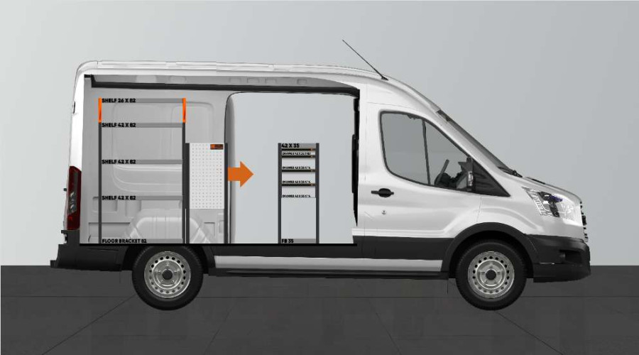 En av de mest populära inredningarna till Ford Transit L2H2. Inredningen ger varierande förvaringsmöjligheter då lådorna på kullagerskenorna ger smidig åtkomst via sidodörren samtidigt som lådorna kan dras ut i färdriktningen för att ge en bra överblick. Dessa går att komplettera med lådavdelare för att maximera strukturen bland det mindre sortimentet. Våra djupa hyllor ger även bra förvaringsmöjligheter för såväl verktygsväskor som mindre maskiner. Fördelad lastvikt i lådorna på kullagerskenor är 35kg/st. Lådornas innermått är (mm) B:308, D:387, H:60 och H:130.