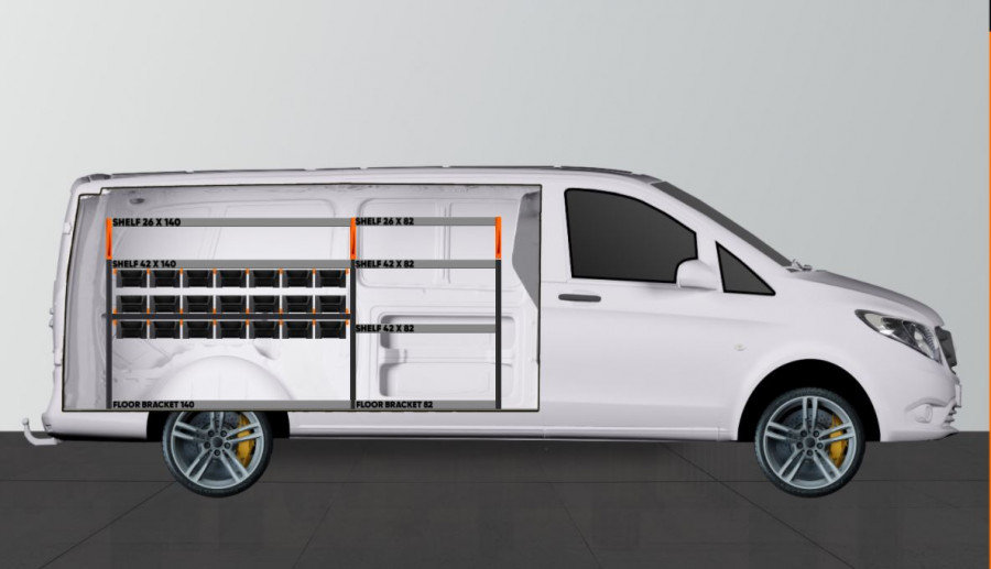 V-Rack är en ny, branschledande bilinredning. Passar perfekt för dig med behov av bra förvaringsmöjligheter för ditt sortiment såsom skruv, kopplingar, bultar, borr mm. Denna inredning är maximerad med totalt 21 st av våra nya, avdelningsbara modulbackar. Modulbackarna dras ut på fastmonterade skenor vilket ger möjlighet till smidig åtkomst. Fronten på modulbackarna är utformad för optimal tillgänglighet och går att komplettera med transparent front och tvärsgående mellanväggar som går att sätta efter varje 60mm. Inredningen passar Mercedes Vito Extra Lång, och som alltid gällande vår bilinredning, alltid till marknadens bästa pris.