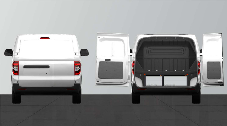 Lastbredden i lådorna bakåt är 570 mm & 395 mm, i sidodörren är lastbredden 570 mm.